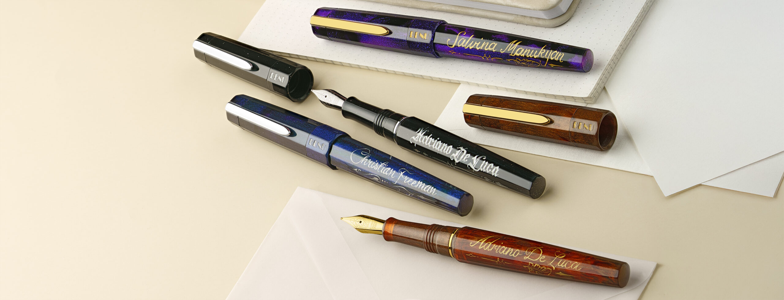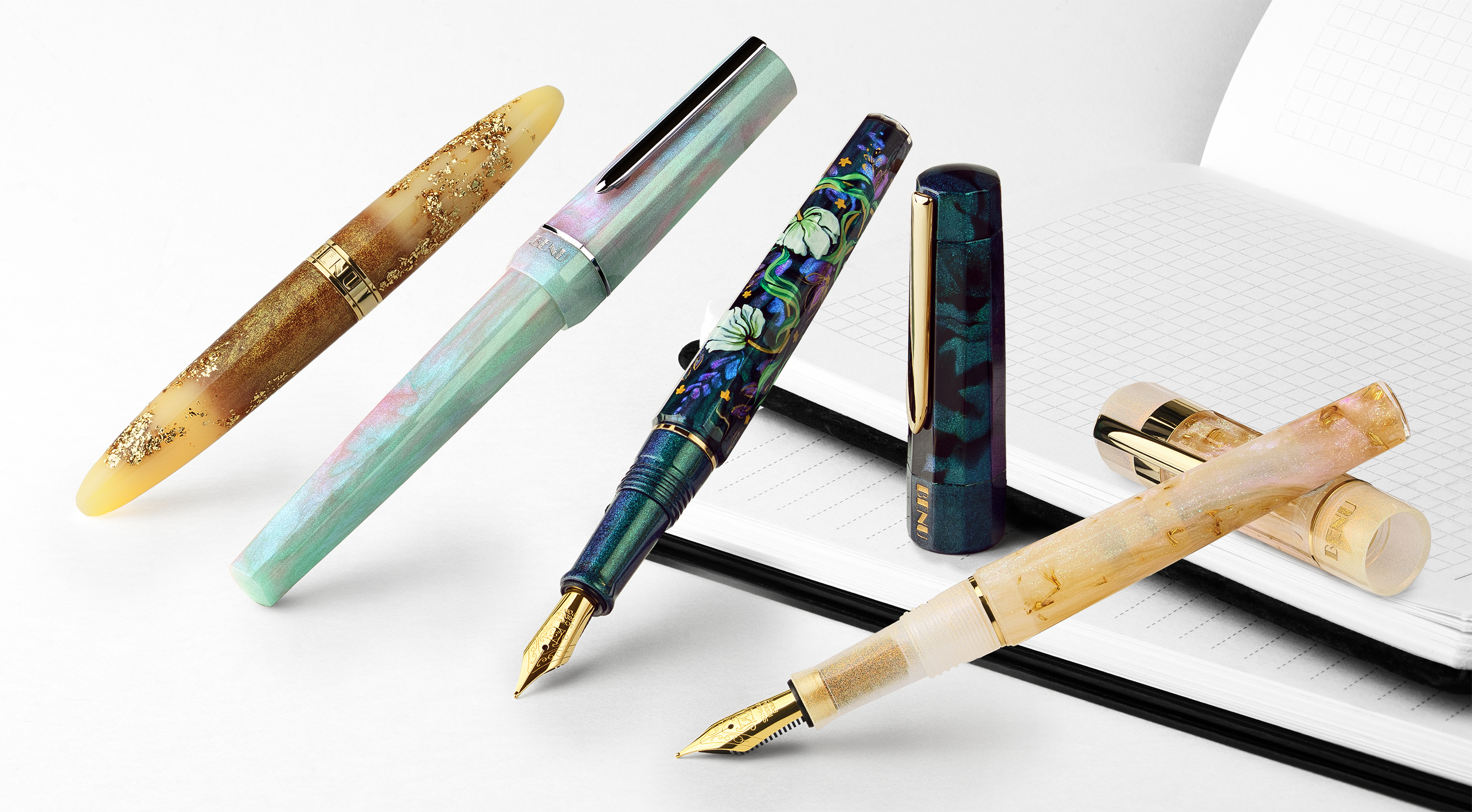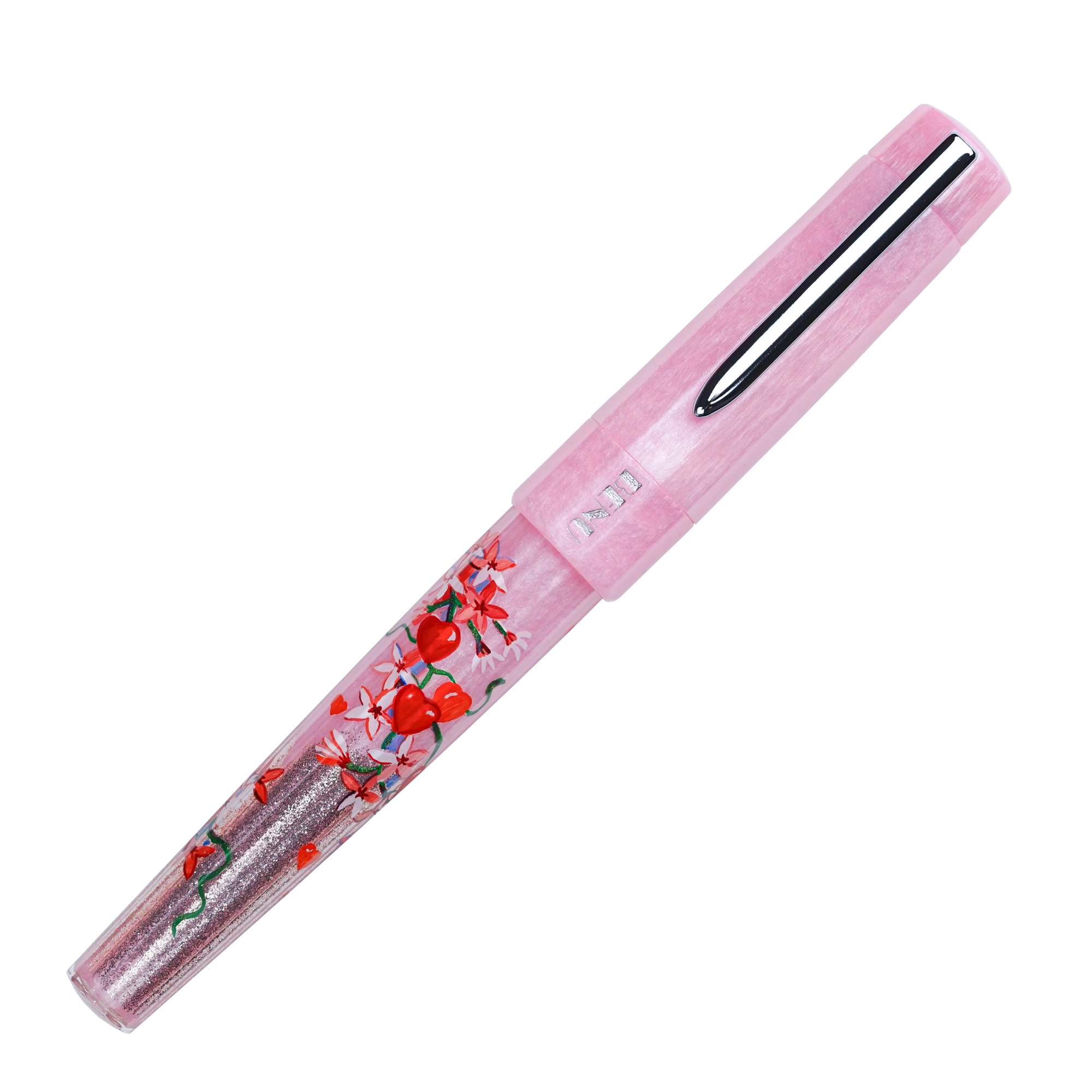 A romantic ode to love, Cupid’s Garden captures the delicate allure of a blooming garden. Hand-painted by our talented artist, Khachatur Abrahamyan, it features a soft pink base adorned with vivid red hearts and climbing blossoms, symbolizing passion and affection. The pen’s body seamlessly transitions into a pearly light pink, beautifully complementing its design. Available exclusively at BENU’s online store.