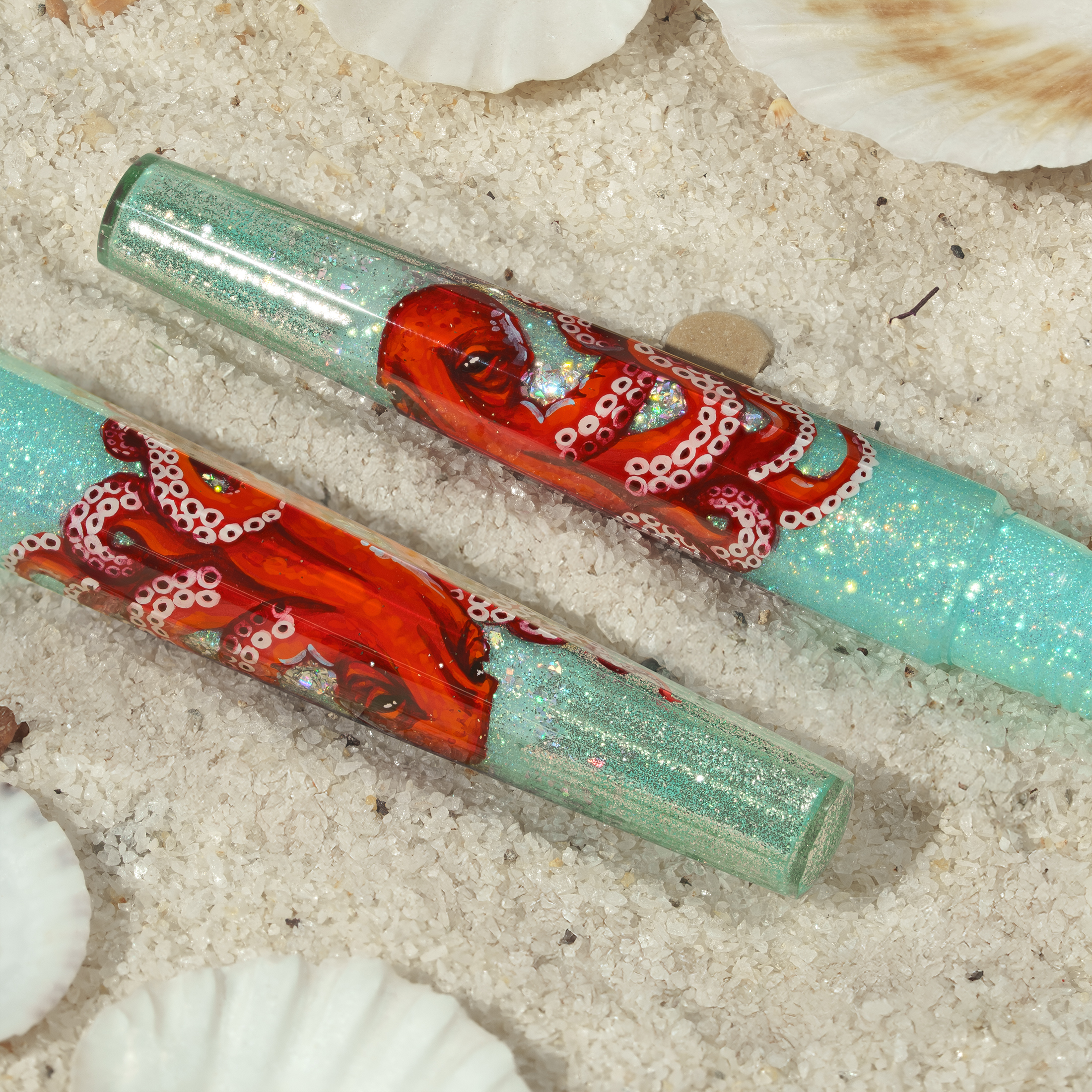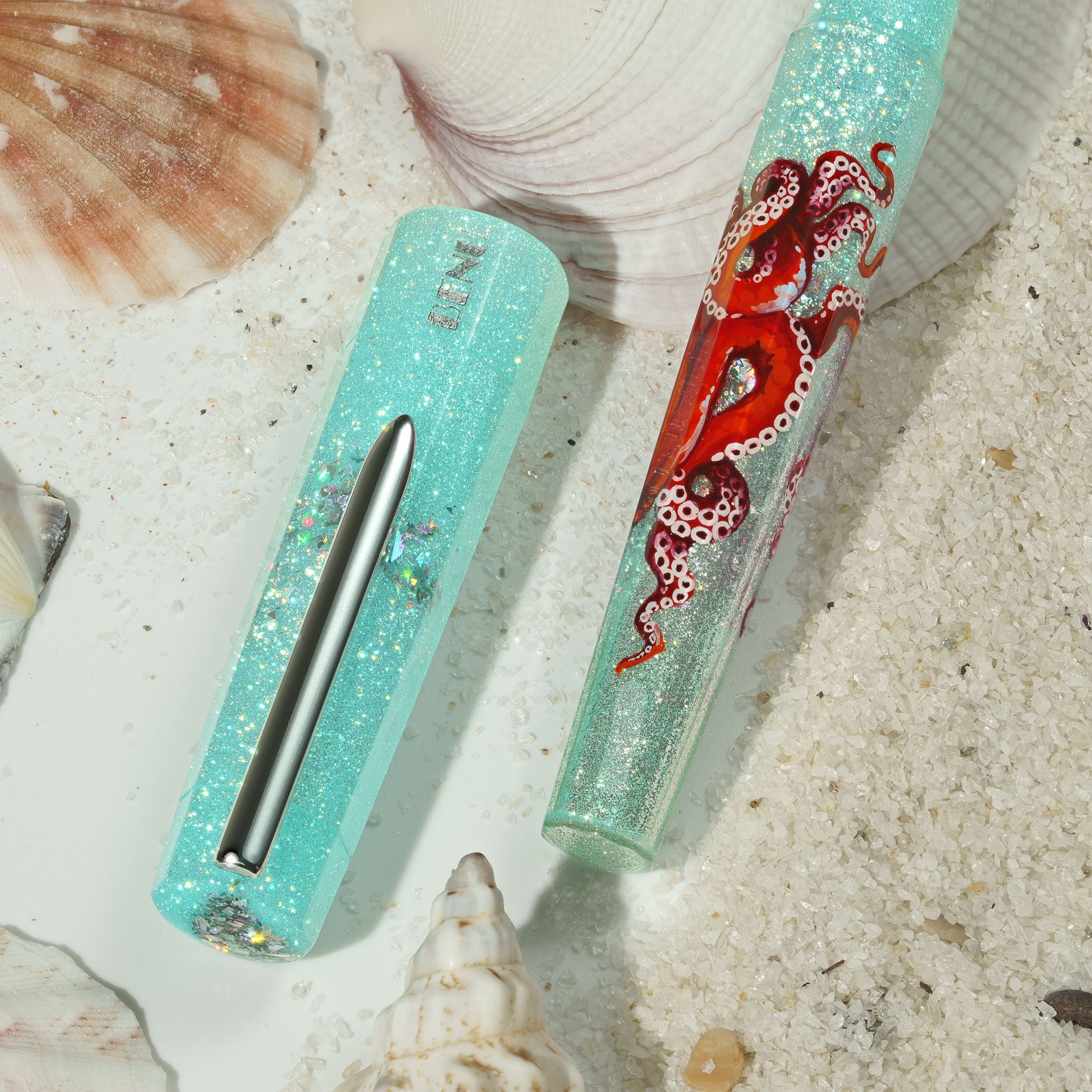 Neptune’s Reach is an exquisite hand-painted piece, rendered in an ocean-blue azure color that seamlessly transitions into pearly-silver to evoke the reflection of the sun on the surface of water. The pen features a red octopus masterfully hand-painted by the talented Natalia Doronkina. Beautiful artwork, contrasting colors, and shimmering materials make this pen a wonderful addition to anyone’s collection.
